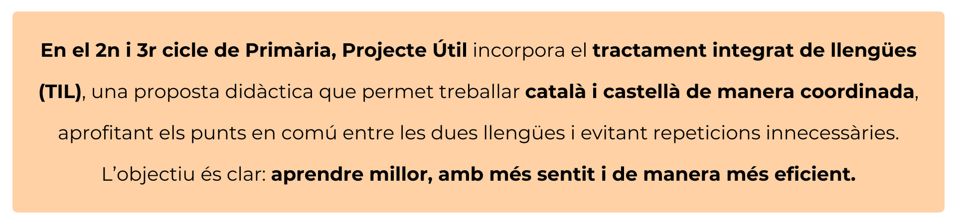 Amb el tractament integrat de llengües (TIL), l'alumnat millora la seva competència comunicativa real i entén millor com funcionen les llengües, ja que les compara i les contrasta. Aquest enfocament afavoreix una major confiança i autoestima, perquè posa en valor els coneixements lingüístics propis. L'aprenentatge esdevé significatiu i reflexiu, i prepara l'alumnat per desenvolupar-se amb seguretat en un món plurilingüe. No es tracta d'aprendre més nocions, sinó d'aprendre-les millor.